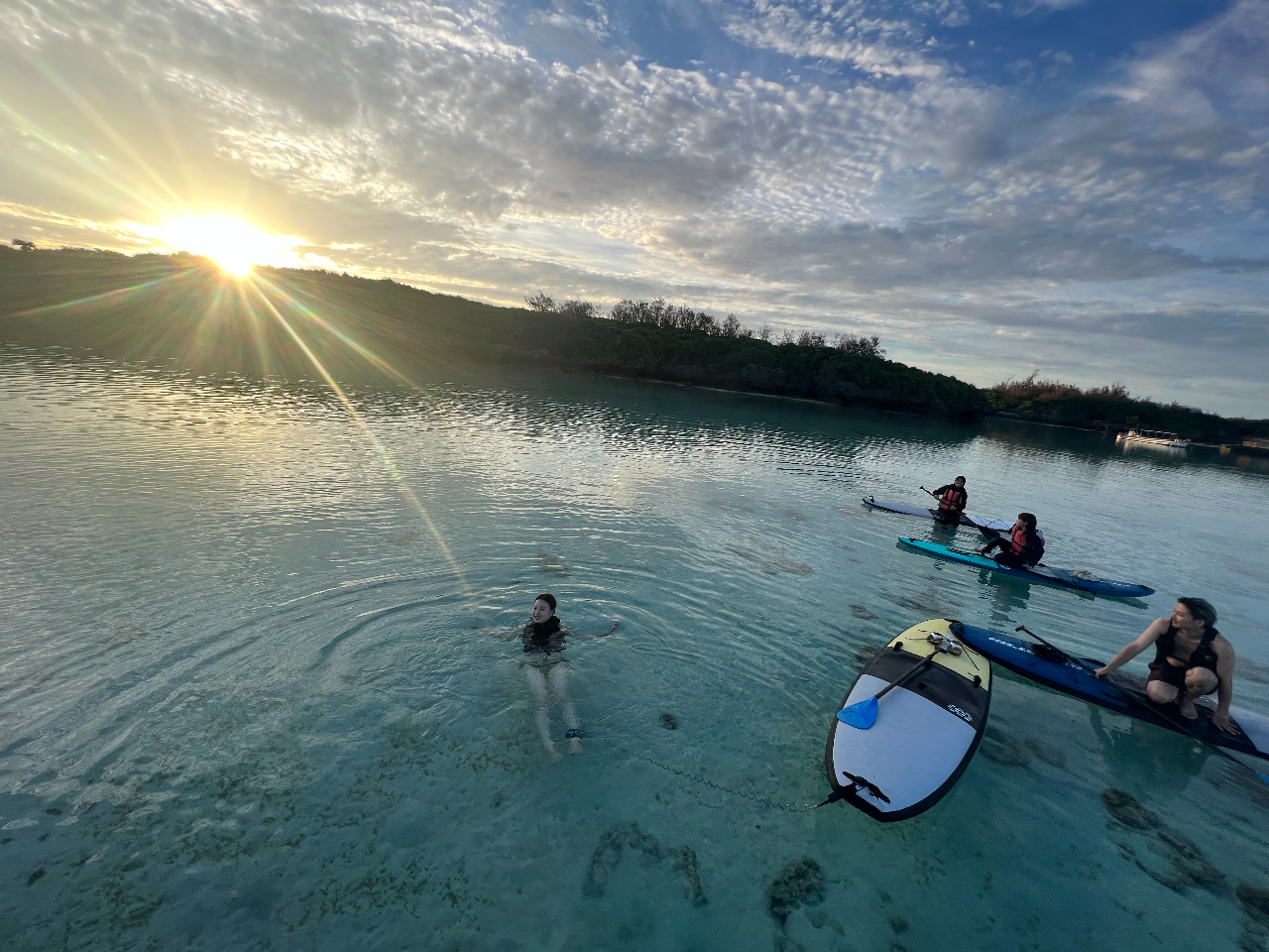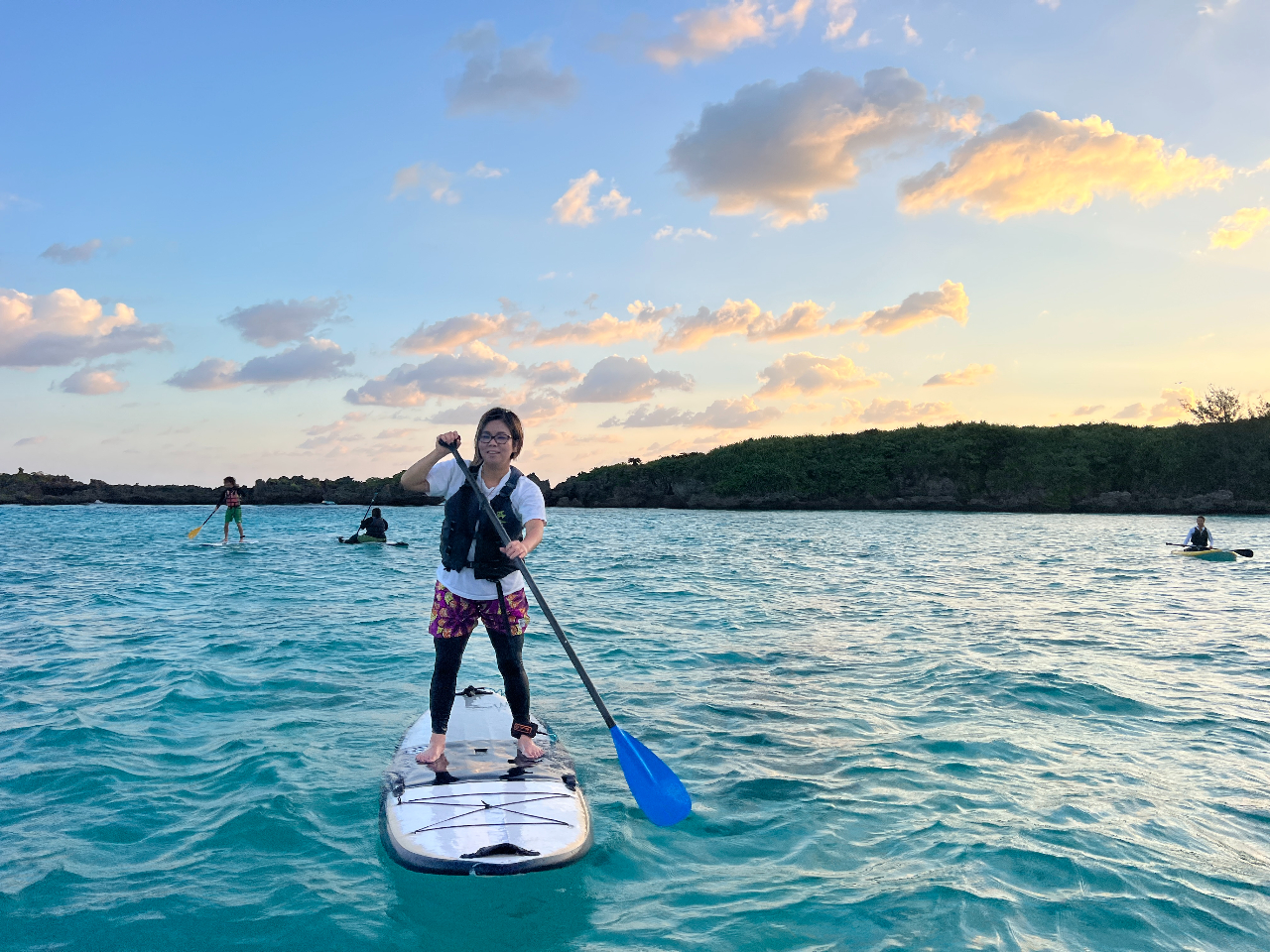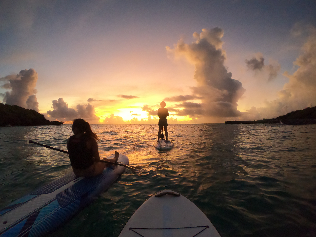 太陽が出てくるまでの数十分前に出港し、そのまま海上で朝日や開けてくる景色を見ながらサップを楽しみます。空が明るくなり、ミナタ離の内側に入ってくると、穏やかでちょくちょく