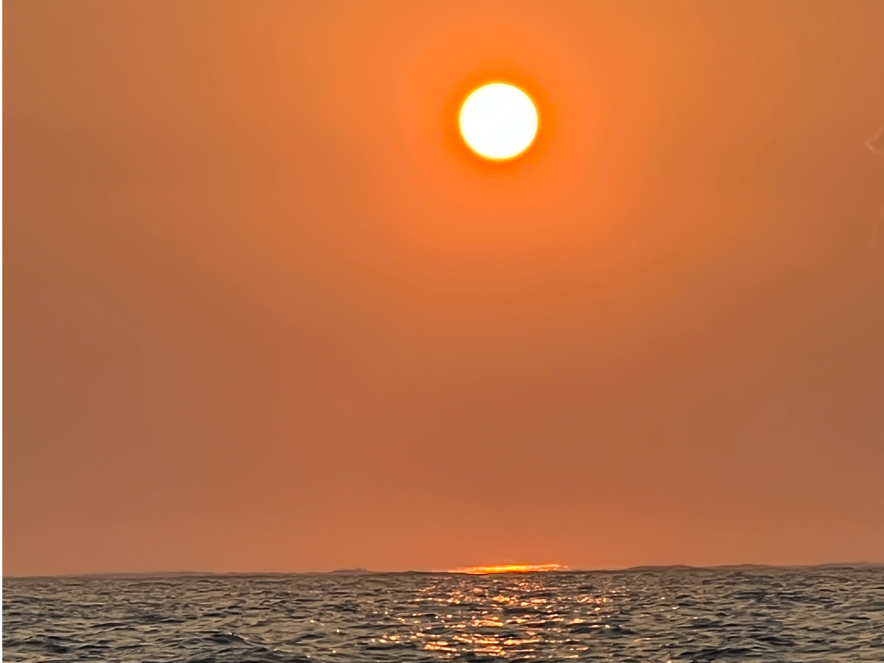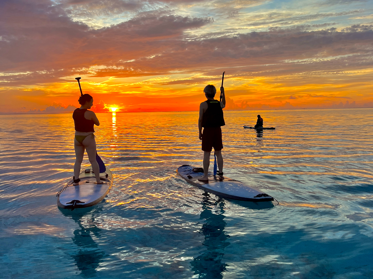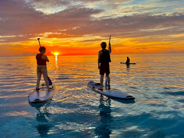 太陽が出てくるまでの数十分前に出港し、そのまま海上で朝日や開けてくる景色を見ながらサップを楽しみます。空が明るくなり、ミナタ離の内側に入ってくると、穏やかでちょくちょく