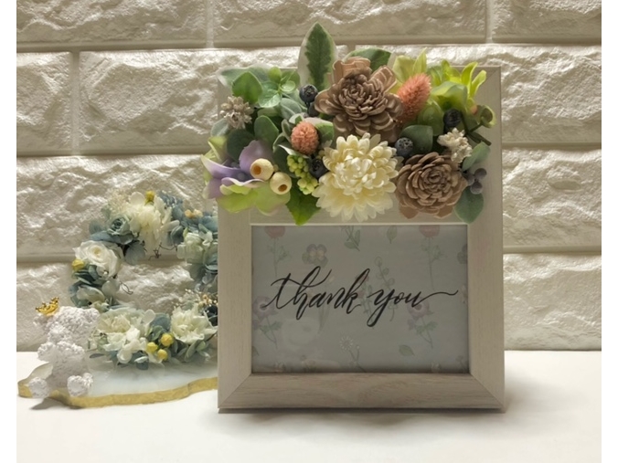 アーティフィシャルフラワーを使用してフラワーフォトフレームをを作成していただき、レタグラフィーの文字の練習、フォトフレームに記入していただきます。