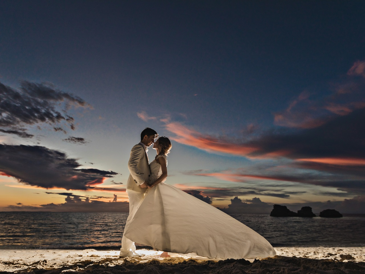 ビーチ撮影にとことんこだわりたいお二人へ、青い海のデイタイムビーチ撮影と、ロマンチックなサンセットビーチ撮影がセットの欲張りプランをご用意