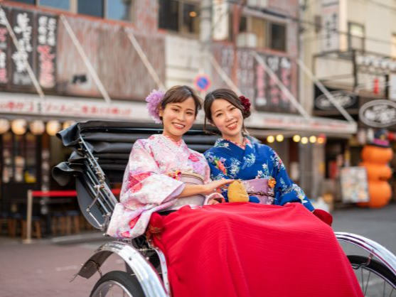 【和装で新世界人力車体験】★ペア限定★着物レンタルに新世界周遊人力車20分乗車付き!着物は18時までに返却