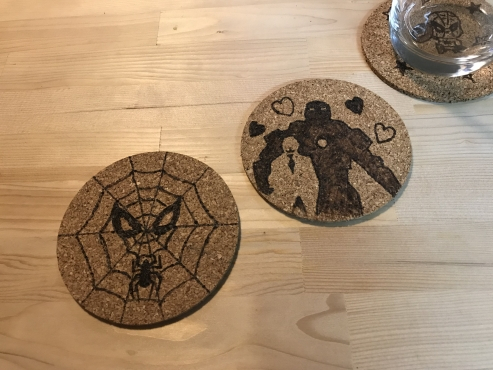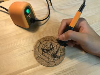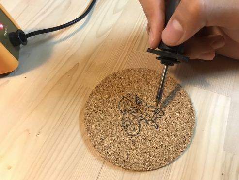 ウッドバーニングとは、電熱ペンを使って木を焦がして絵や模様を付けていく技法のことです。この方法でオリジナルのコルクのコースターを作って頂けます。