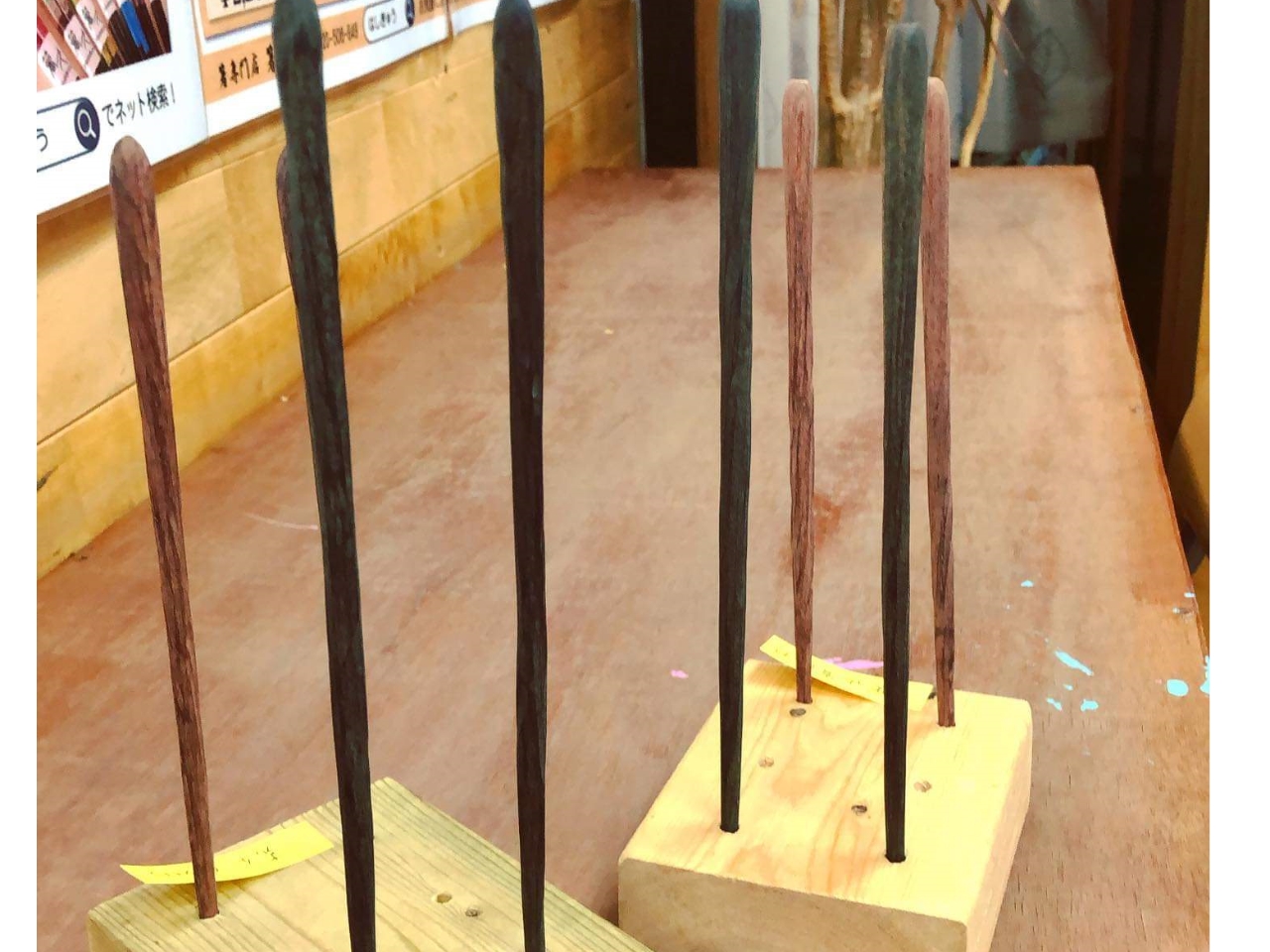 あの細い箸に・・・絵なんて描ける?難しい・・・かなり難しいです。一応、すぐ描けるように家で考えてきたけど思うようには描けません。大きい箸と一緒に写真を撮って頂いたり削り機を見せて頂いたりと、ありがとうございました。