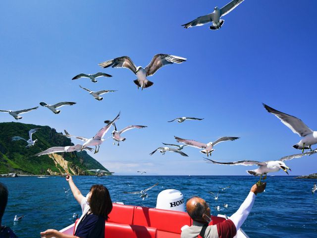 大好評!カモメ餌やり体験 。飛んでいるカモメをこんな間近で見たことがない! 感動するお客様の声を多数いただいております