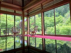 係りのスタッフさんか撮影のポイントを教えて下さり写真も撮影して頂き、パンフレットのような写真が取れました。秋は紅葉が綺麗だと思いますが春も美しい緑のもみじが水面に映え美しく、また川沿い石にも緑の苔がまぁるくついて綺麗でした。散策も池の周りのショートコースは15分程度、ロングコースもゆっくり歩いて30分程度です。