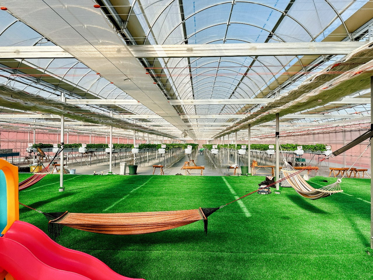 ○きれいなハウス内には人工芝の遊び場が!ゆっくりお楽しみいただけます。