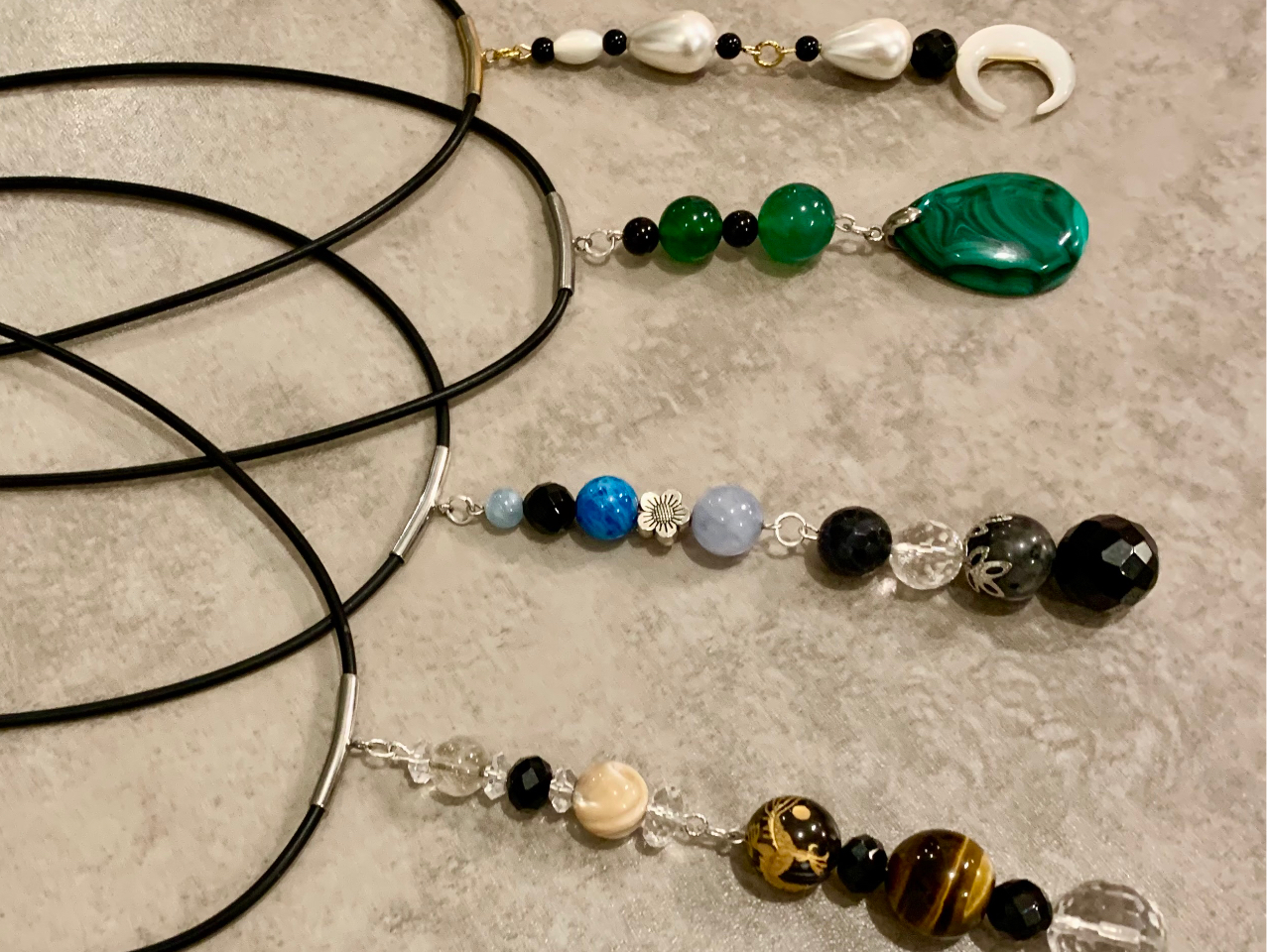 ネックレスは、革紐を使うことが多いですが、近々チェーンネックレスも入荷予定です。写真のもは長めに石を並べておりますが、長さはご希望通りに作ることが可能です!