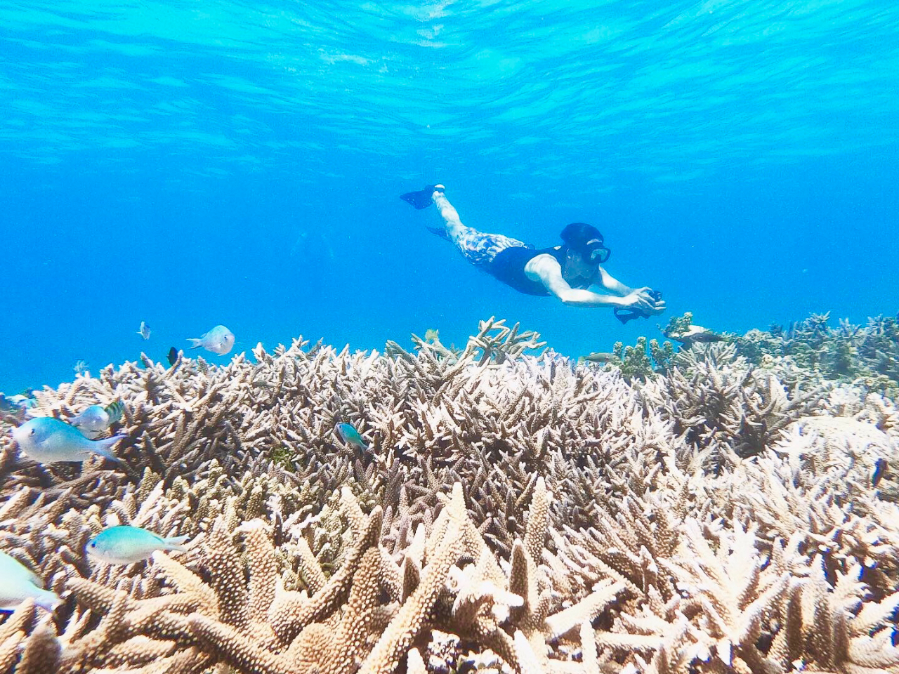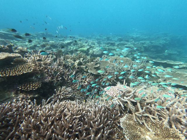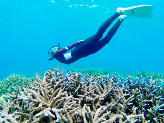 島人オーナーガイド自慢のオリジナルポイントへご案内。どこまでも続くサンゴ礁やたくさんのお魚たちに感動!