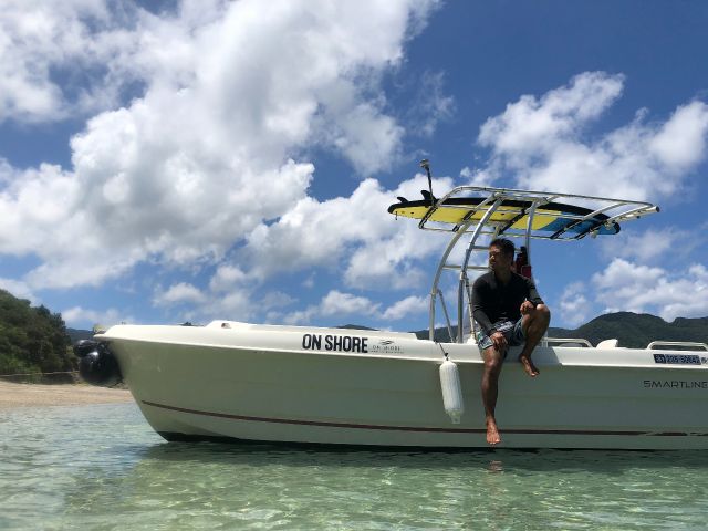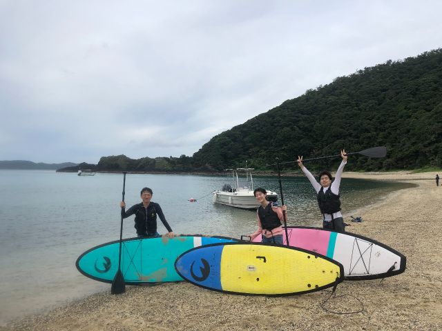 当日の流れ:龍郷町芦徳にあるショップに集合し同意書の記入やお支払いの確認をして、ショップから徒歩1分芦徳漁港にある船に乗り出航します。約15分でコウトリビーチへ到着。ビーチについたらSUPのレクチャーを受けてSUP体験へ、条件が良ければサンゴ礁がきれいなポイントへご案内。ツアー終了後はショップに戻り個室シャワー室、ドライヤーがあるメイクスペースへご案内します。