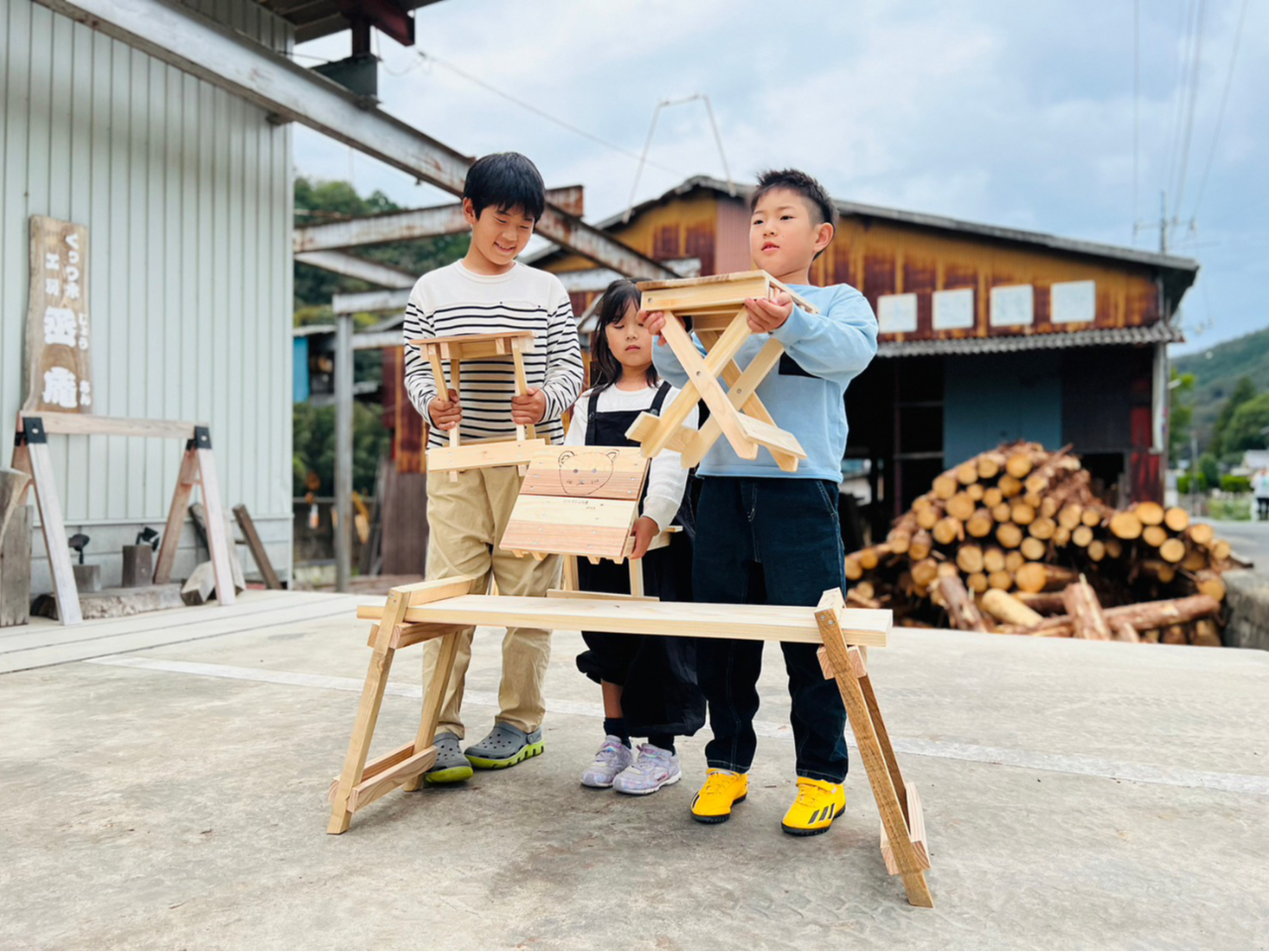 地元産のヒノキ材を使用した『折りたたみ椅子』と『カッティングプレート』。さらに、一枚板スギ材と足がヒノキ材を使った『簡単収納型ウッドスタンドテーブル』を自分たちで作ってキャンプ場で使おう!