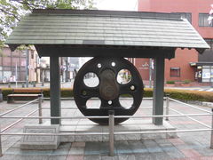 駅西口のロータリーの端に車輪のモニュメントが展示されております。