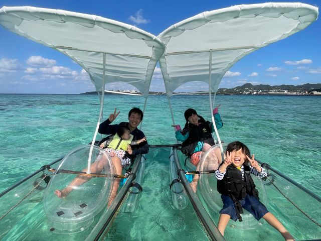 沖縄本島でもトップクラスの海の綺麗さを誇る瀬底島アンチ浜で、オールクリアの屋根付きグラスカヌーに乗り、のんびり遊覧ツアーに出かけましょう!
