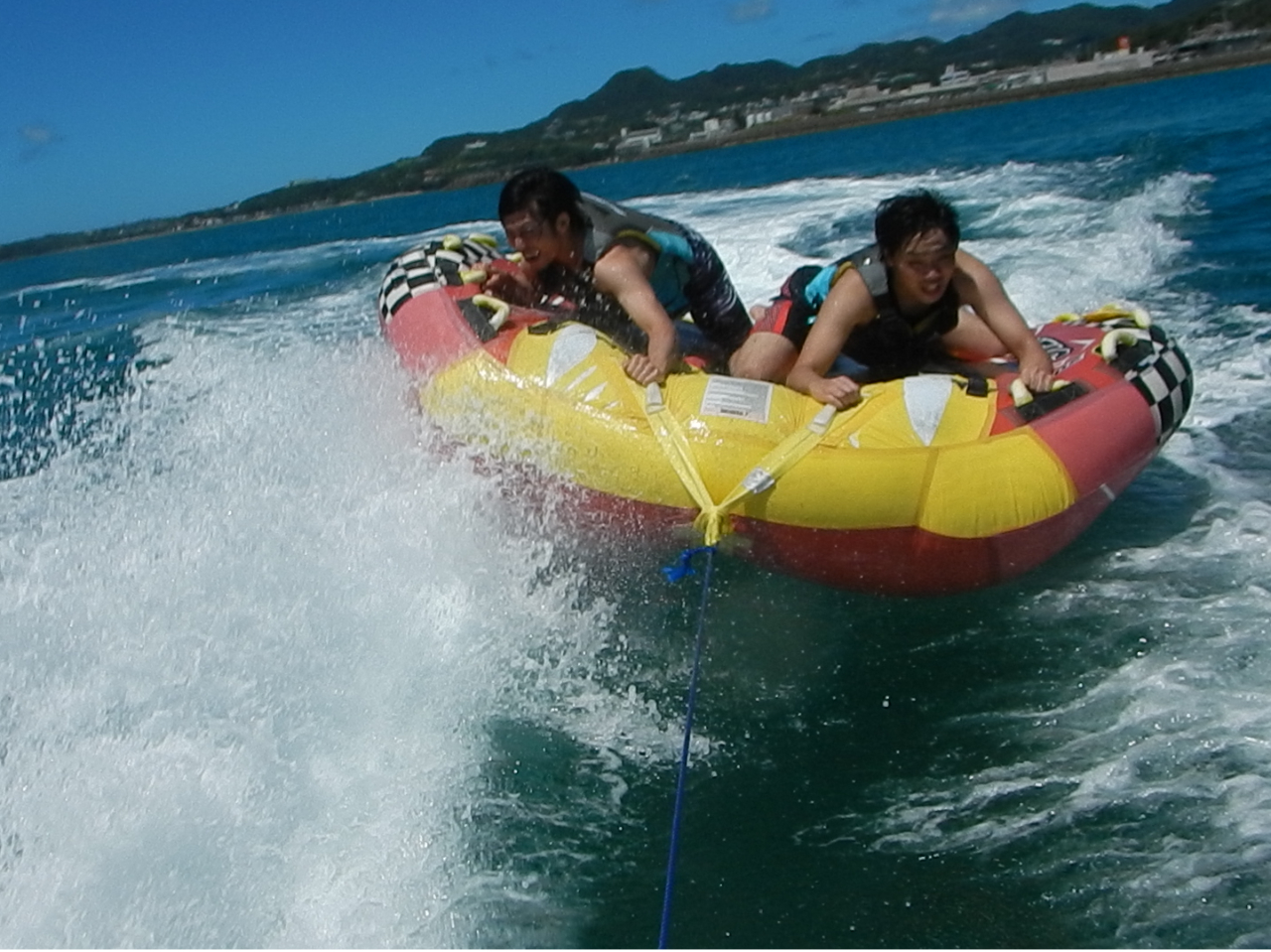 シングルバナナボートはチームワークが試されますので是非仲の良い友達やご家族などとお乗りください♪
