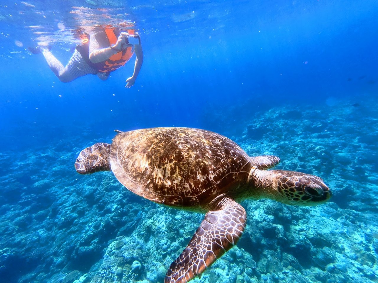 ウミガメと一緒に泳げた喜びは、きっと忘れられない思い出になるはずです!シュノーケリング・ボートシュノーケル