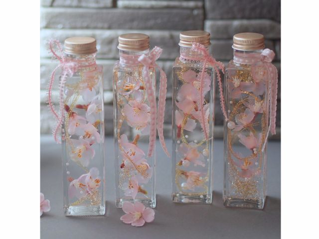 お花だけでなくパールやキラキラリボンを入れてオリジナルあふれるボトルを作ろう!