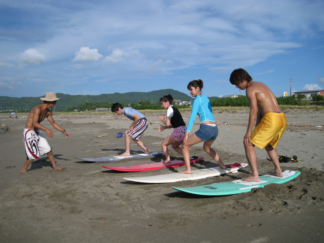 まずは、砂浜上でルールやマナー注意事項などを説明から始まり、実際にボードの上でパドリングやテイクオフ感覚を体験、その後に海でのレッスンに移ります。