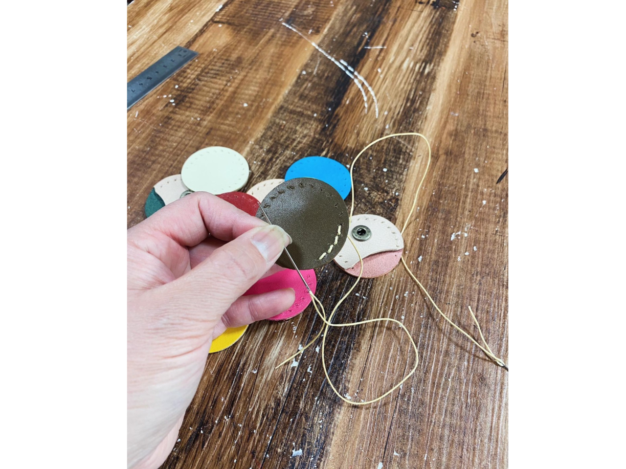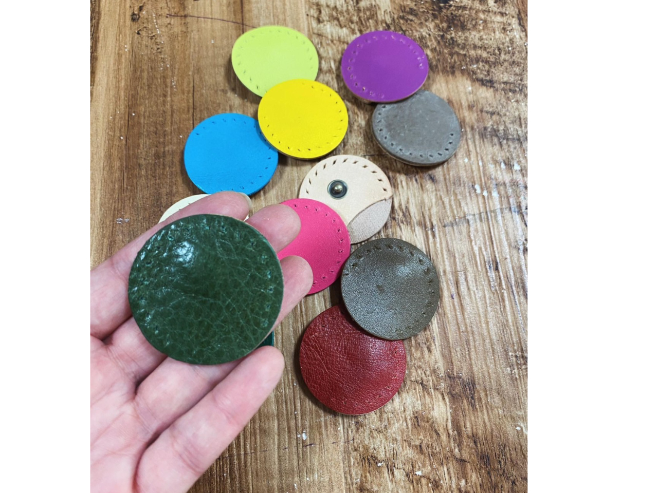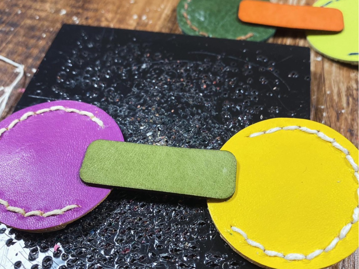 @カラフルな革パーツの中から好きなお色を選びます