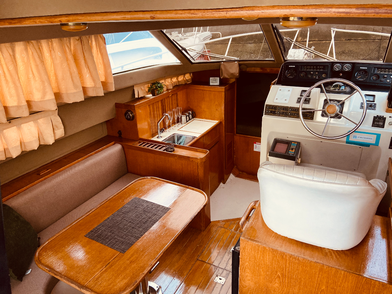 船内の様子です。木の温もりを感じるとても落ち着いた内装のクルーザーです。特別な日、デートや記念日に是非ご利用下さいませ。