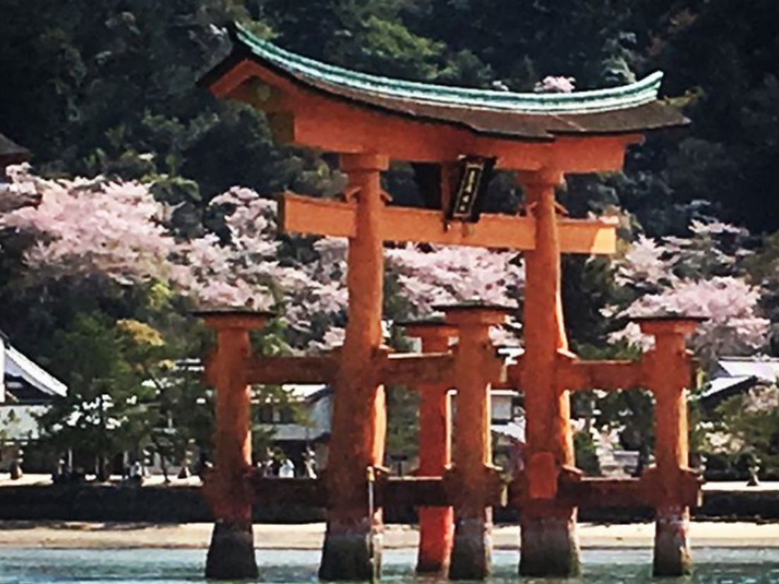 厳島神社の回廊と海面のギリギリの美しさと記念撮影できます。