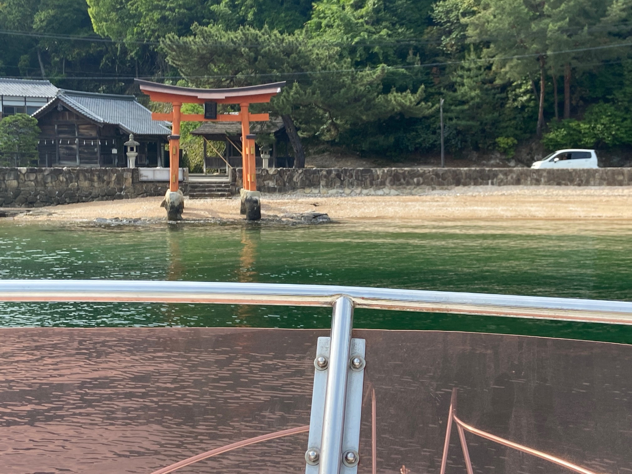 満潮のタイミングに合わせて、船で境内に入らせて頂き、船上より二礼二拍手一礼の作法でご参拝を体験していただけます。 その後 鳥居の外側で ドロ−ンによる撮影を行います。