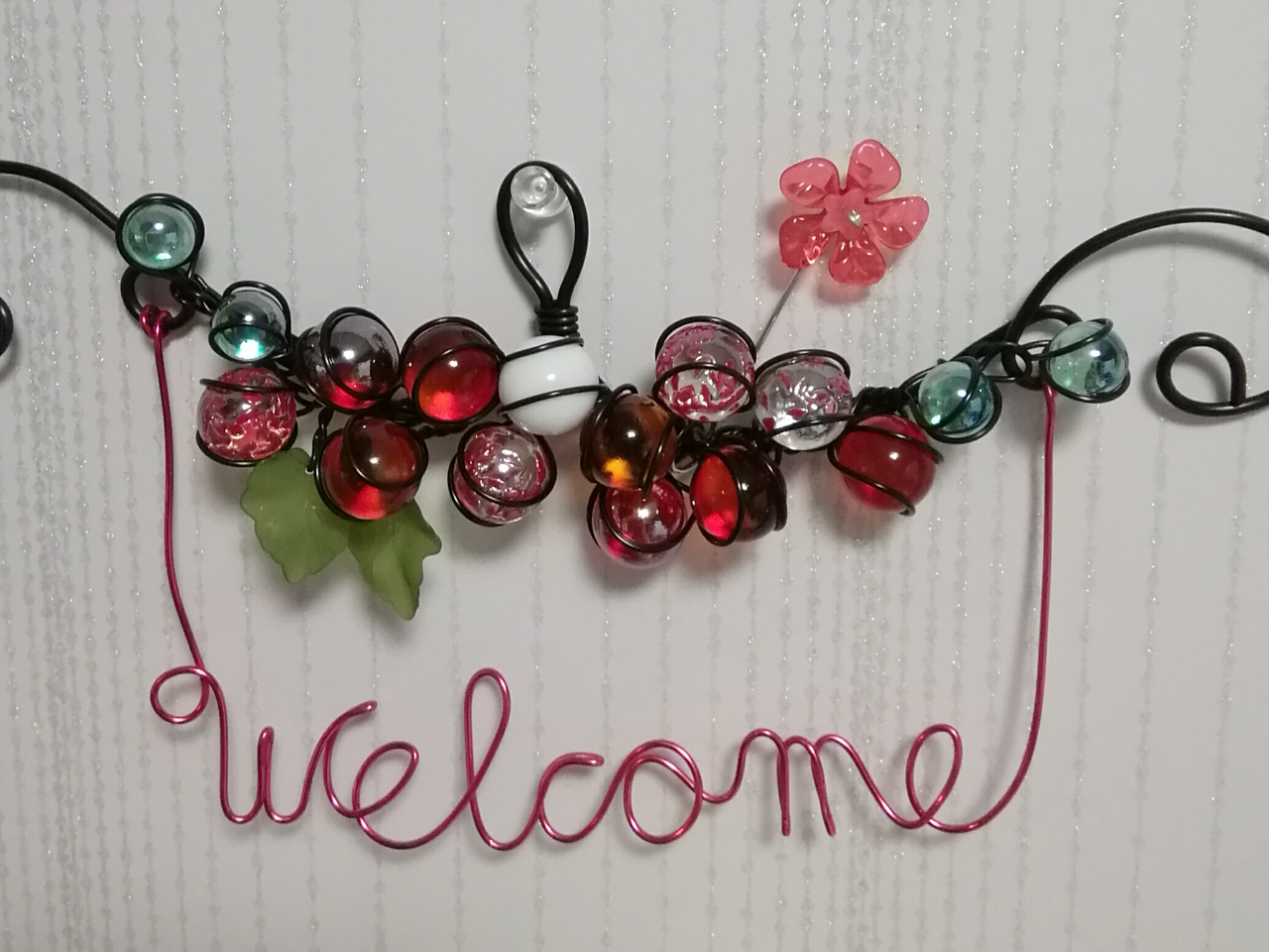 好きなビー玉を選んで個性的な作品を作ることができます。天使のワイヤーの「welcome」を添えて世界でひとつのオリジナル壁掛けの仕上がりです。