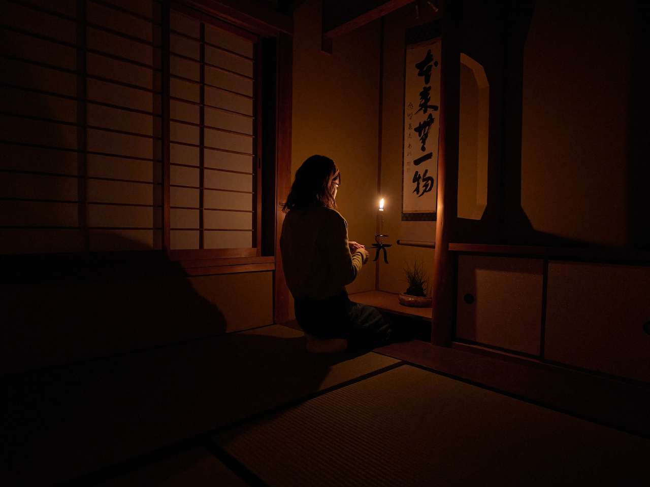 日が暮れて蝋燭のあかりのみで行われる特別な茶事