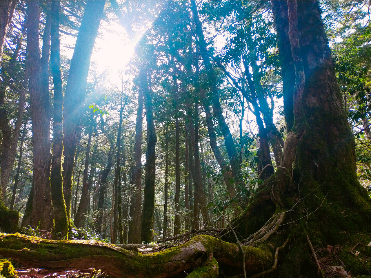 夜露に濡れたみずみずしい青木ヶ原樹海を朝日が照らし神秘的な美しさに。