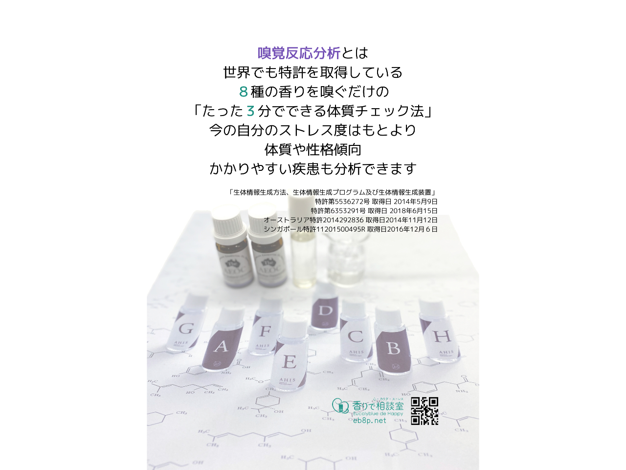 たった3分で心と体の状態を“見える化”できる話題の特許を取得した手法、「嗅覚反応分析」が体験できます。8種の香りを嗅いで好きな順に並べるだけで、ストレス傾向・体質・性格傾向をグラフ化。嗅覚反応分析士があなたに合ったセルフケアや香りの活用法を丁寧にアドバイスします。さらに、分析結果に基づいてオリジナルのアロマクラフトを作成!香りの好みと心身の状態の関係を楽しく学びながら、自分にぴったりの香りを持ち帰れます。