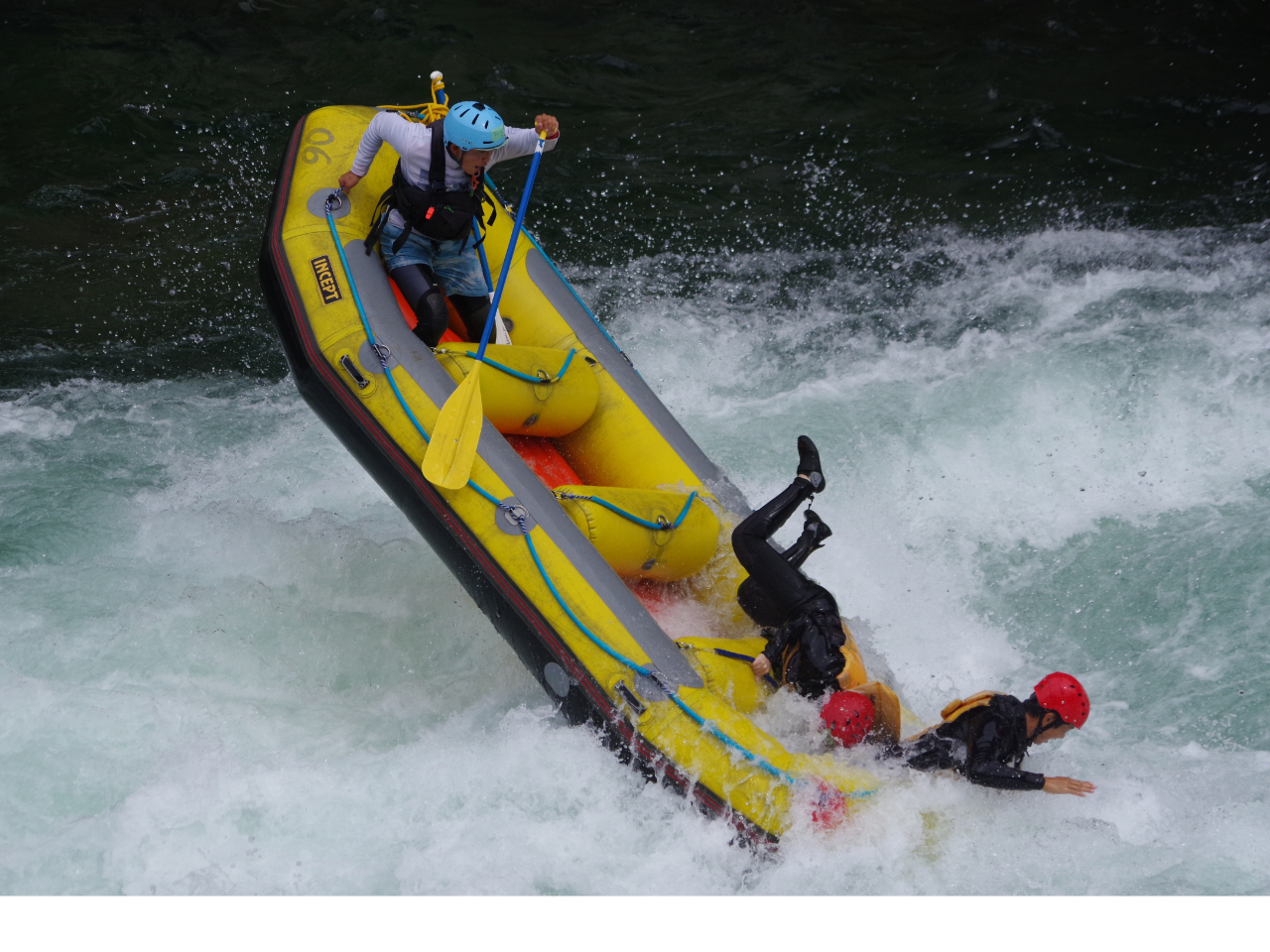 ラフトボートにはお客様最大7名+ガイド1名、最大8名のクルーで激流に挑みます。