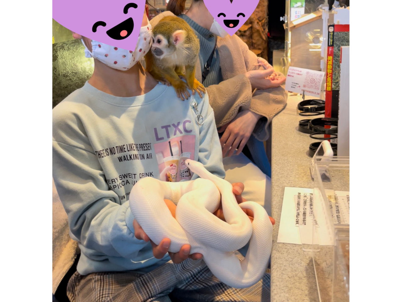 他ではないリスザルなどが肩や膝の上に乗って来ます。