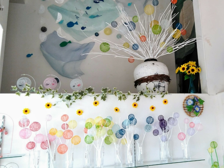 お好きな色の糸をお選びいただき、風船に巻き付けていきます。