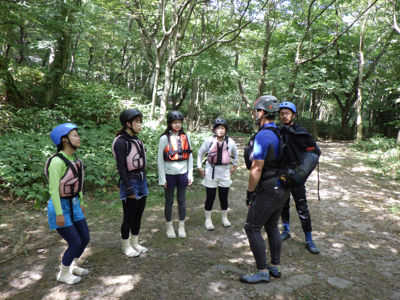 各自の水着の上にレンタルのウエットスーツを着て、レンタルの手袋、ヘルメット、ライフジャケット、川用靴を装備し、川の流れに逆らって登っていきます。