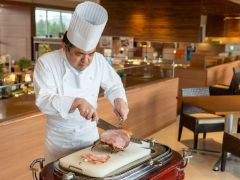 ツアー団体が入ることもありますが、席が広くゆったりと食事を楽しめます。駐車料金は宿泊していなくても、こちらを利用したと申し出ると精算してもらえます。天ぷら盛り合わせ、ローストビーフ、ピザ2種はカウンターのキッチンから、それ以外はブュッフェ台から取ります。補充や食事済みの食器回収は早く、広々と和洋中韓の料理が楽しめます。味付けはそれほど強くないので、塩分を気にしすぎないで楽しめるのも良い点です。