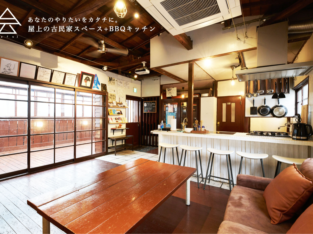 【6名以上/手ぶらBBQプラン!】大阪アメリカ村。喧噪の街から、階段を上へ。 古びたビルの屋上に建つ、青空の下の古民家で貸切BBQ!《ファミリー・友人グループにオススメ》
