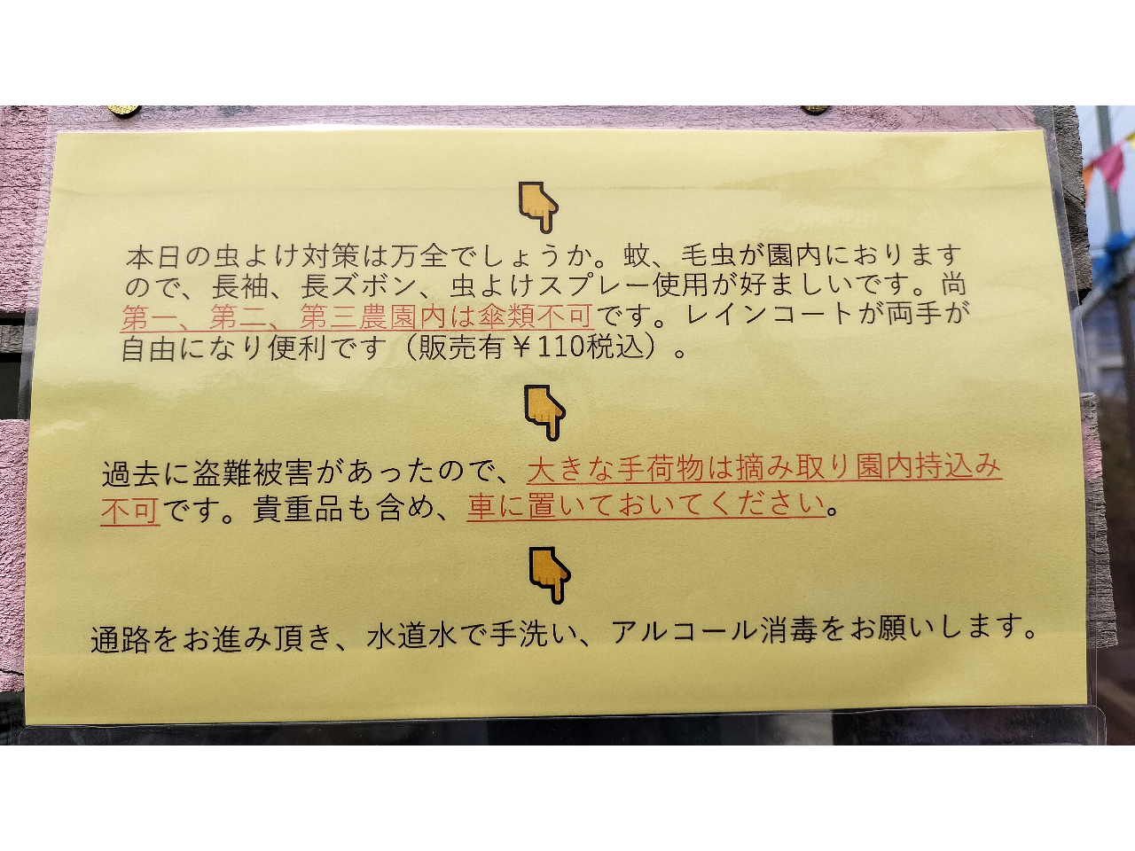 ★雨具(カッパ、レインシューズ)があると便利かと思います(傘類では第一、第二農園、第三農園内侵入不可)。