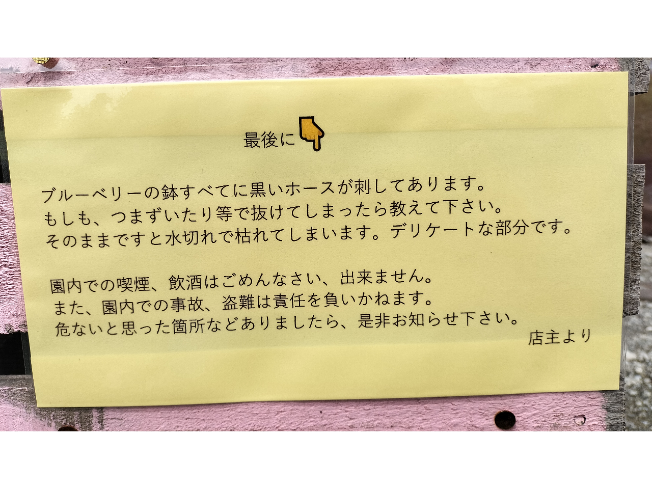 ★パーキングから至近距離でのご滞在になります。両手が自由な、最低限の格好が摘み取り中は便利です。大きな手荷物は持ち込みをご遠慮しています。