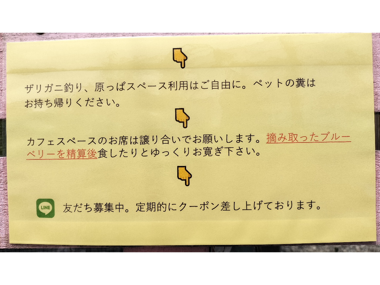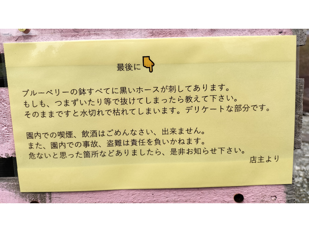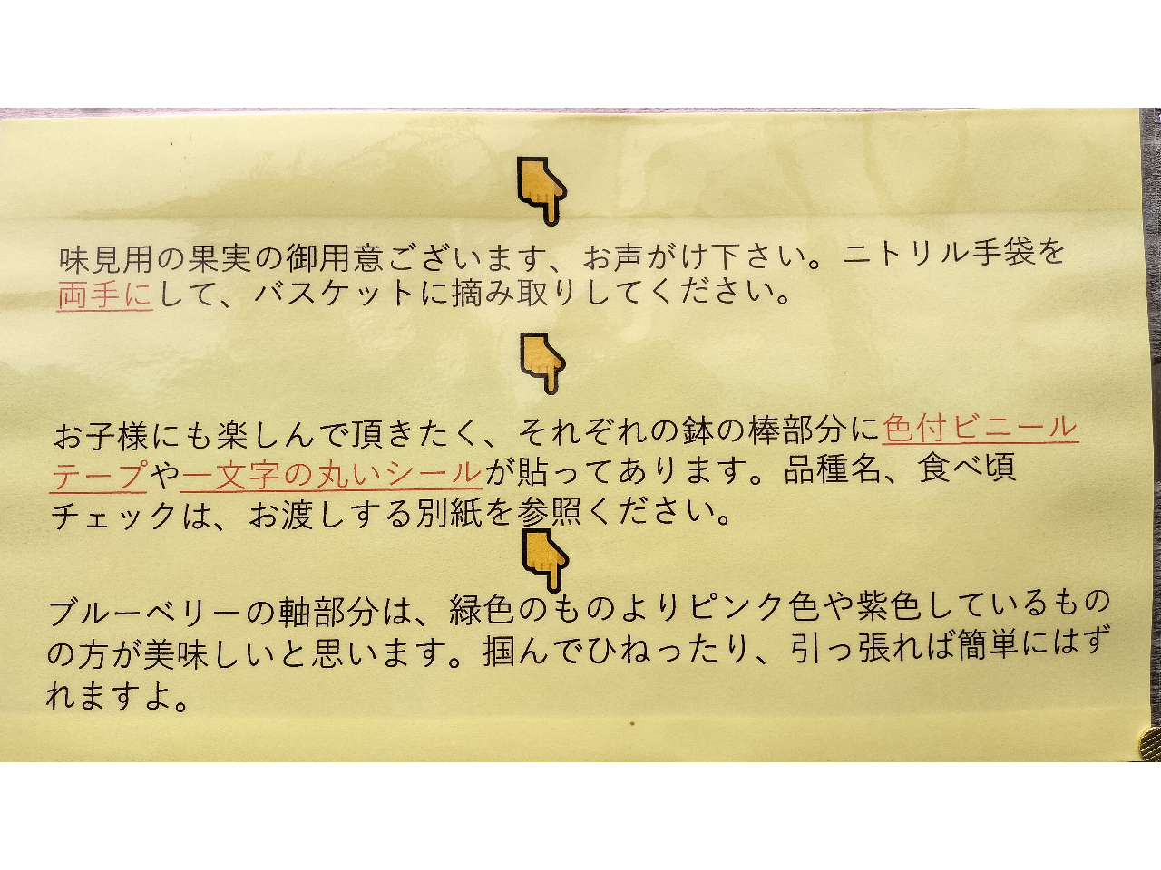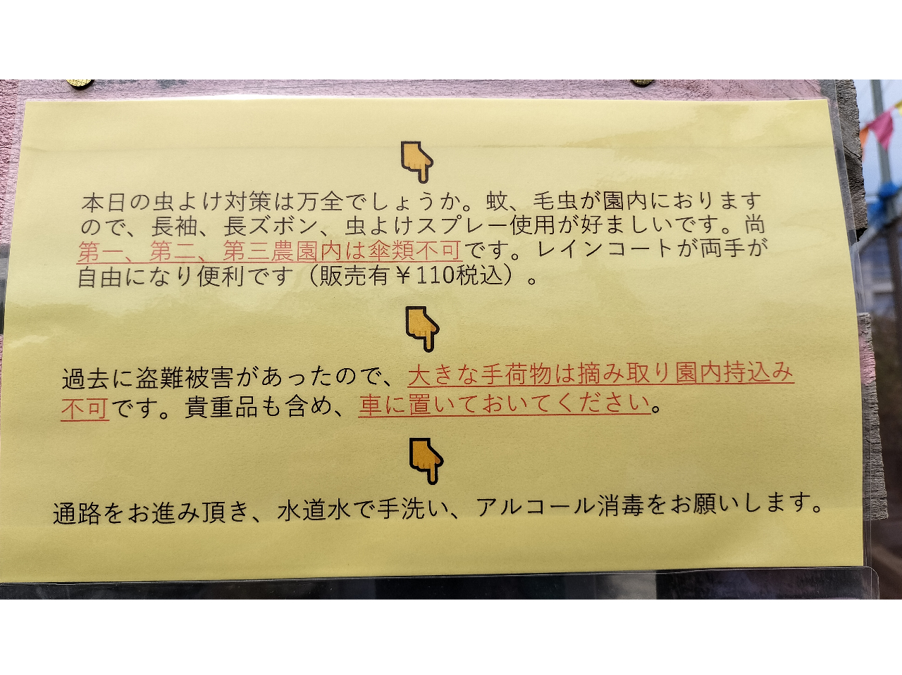 ★過去に盗難被害があったので、大きな手荷物は摘み取り園内持込み不可です。貴重品も含め、車に置いておいてください。