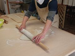 失敗した生地を切る練習させてもらい、奥で店主さんがやり直してくれました。
