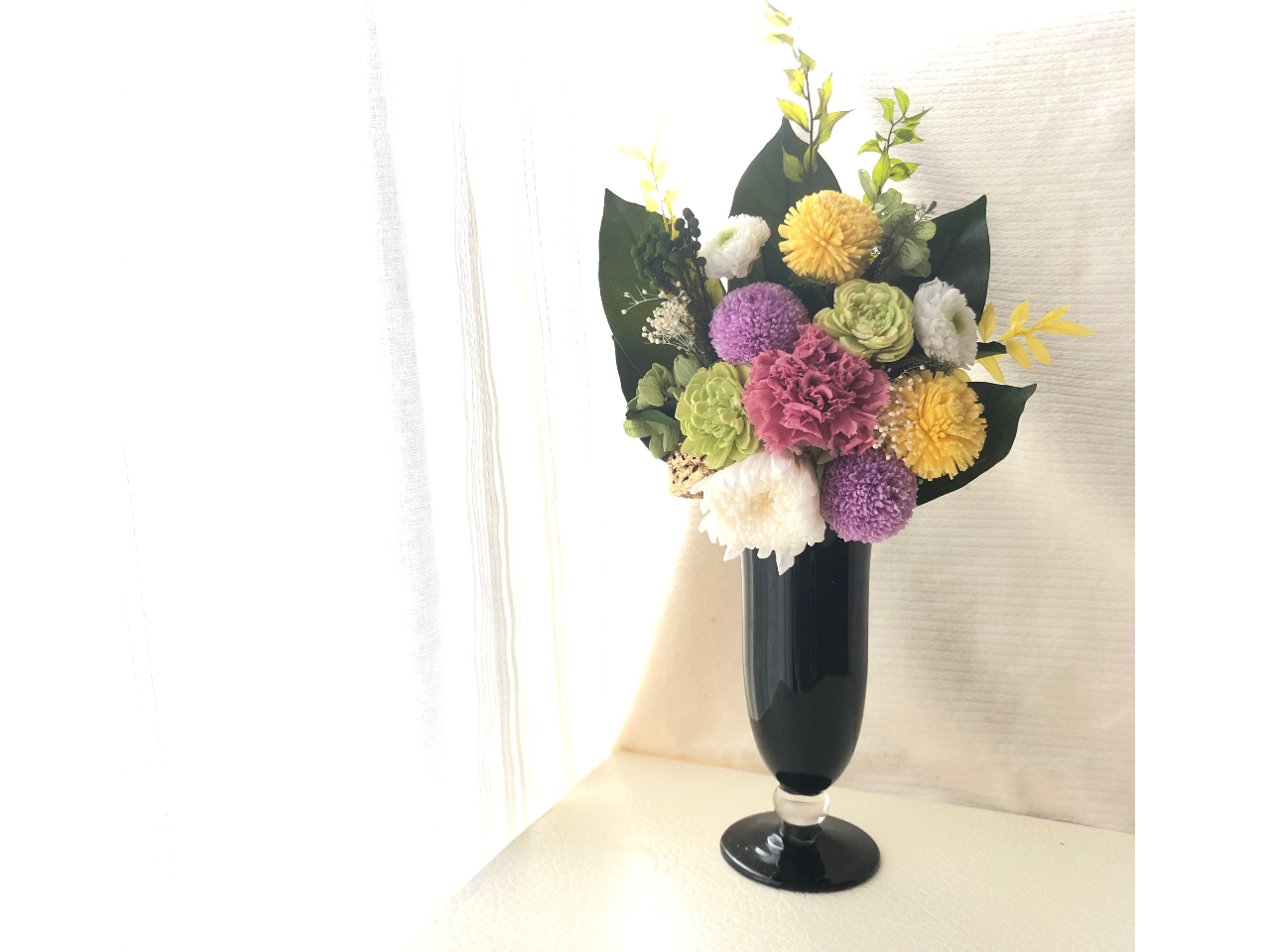 プリザーブドフラワーの仏花、プリザーブドフラワー、アーティフィシャルフラワーのアレンジ。ラッピング付き、