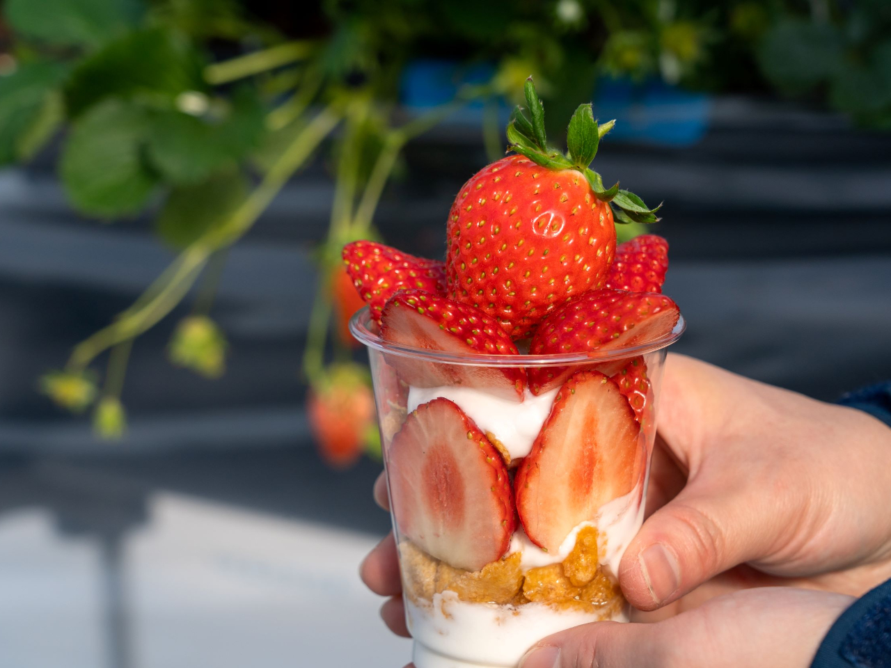 ■自身で摘んだいちごを使い、その場でパフェづくり体験やチョコレートフォンデュも楽しめます♪