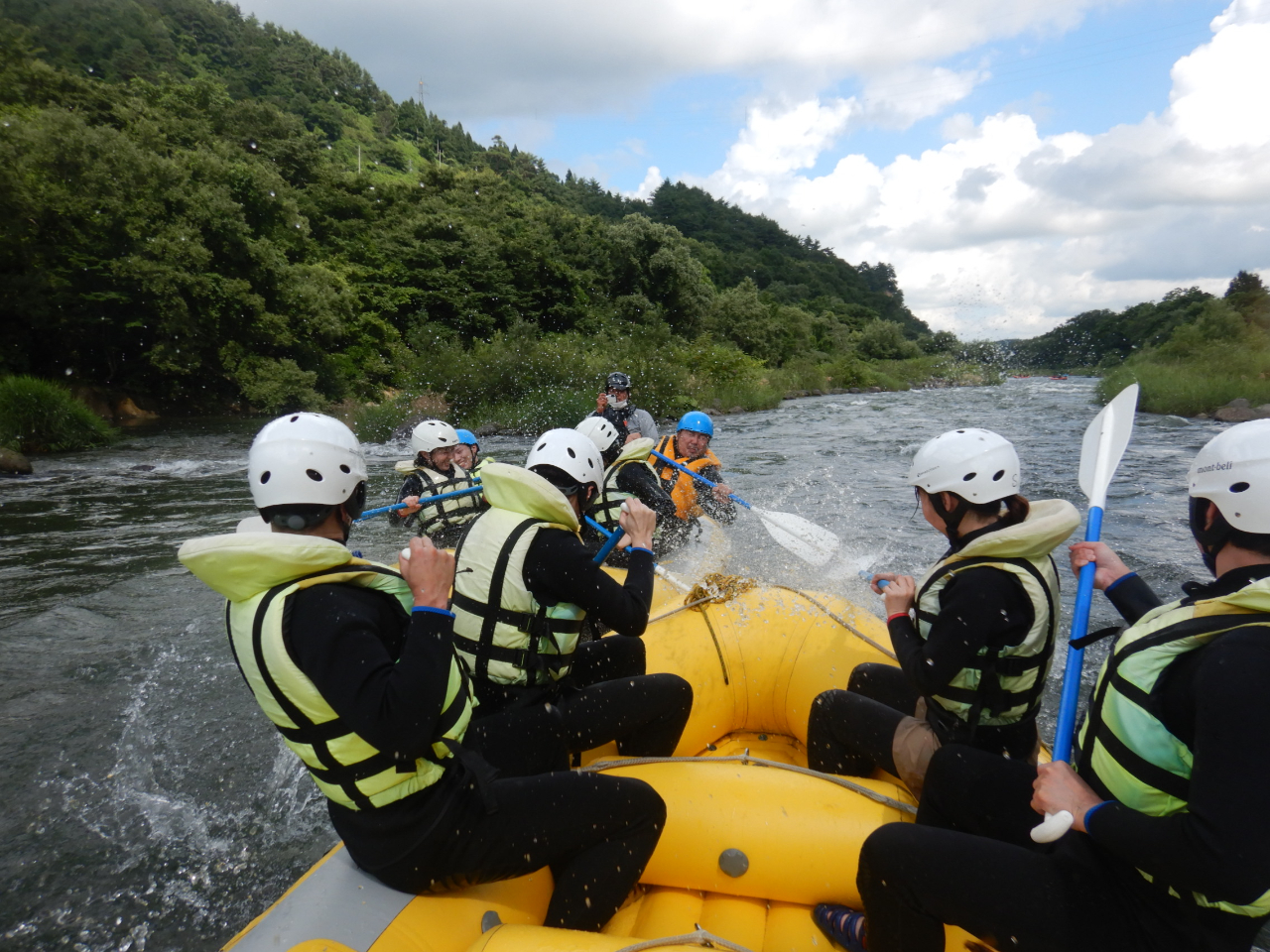 夏の期間的にしか営業できない、急流「胆沢川」の流れをガイドと一緒にラフトボートに乗り、仲間と力併せて漕ぎ下ります。