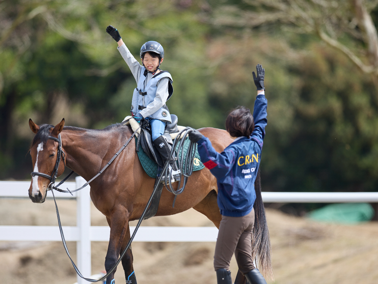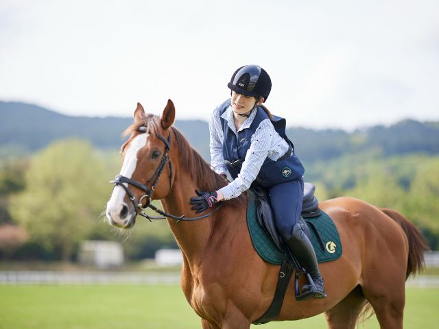全く初めての方を対象に馬に触れるところから、馬に乗って発進・停止の合図や誘導、少し走る所まで気軽に体験できるコースです。