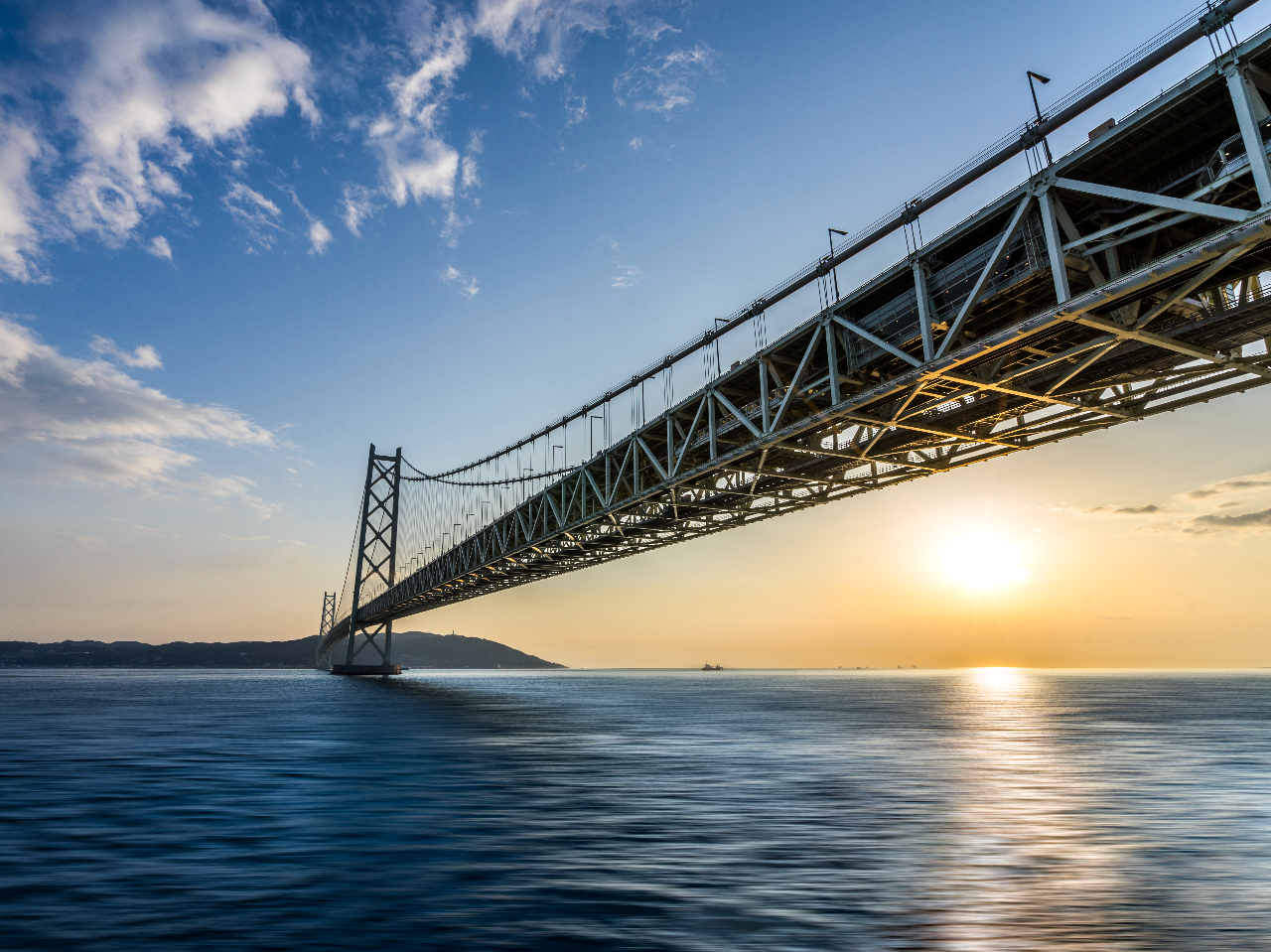 世界最大級の吊り橋「明石海峡大橋」と、水平線から昇る「初日の出」