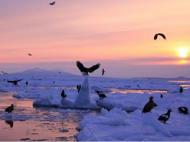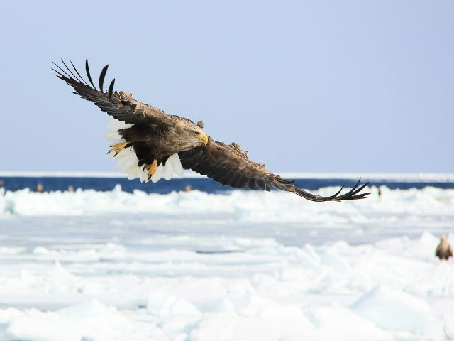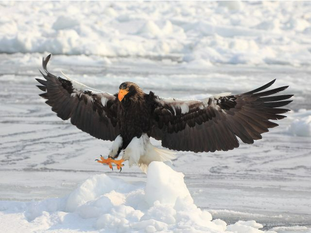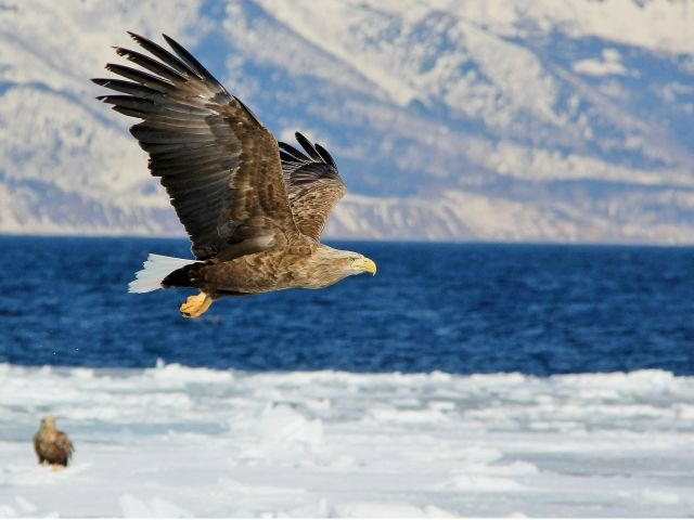 地球上で6000つがいしか生息していないオオワシが流氷の上に舞い降りる姿を間近で観察して写真を撮りませんか?
