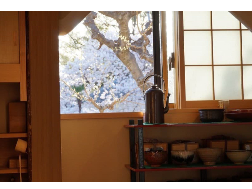 2階には 靴のままで、椅子に座りながら、正座の目線で楽しめるよう工夫した茶室があります。季節ごとに、茶室の設えとお茶碗を変えています。