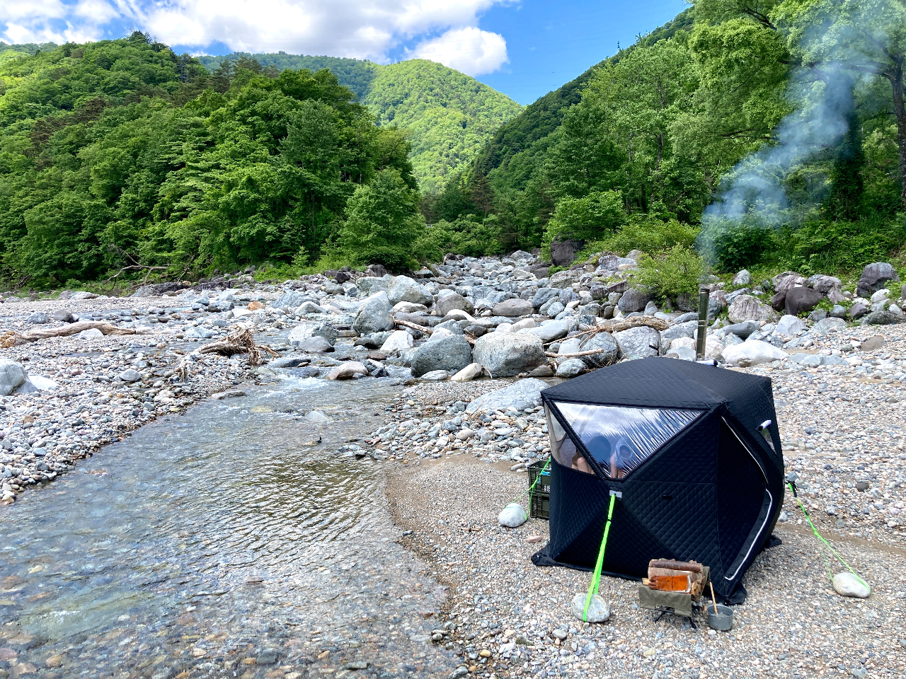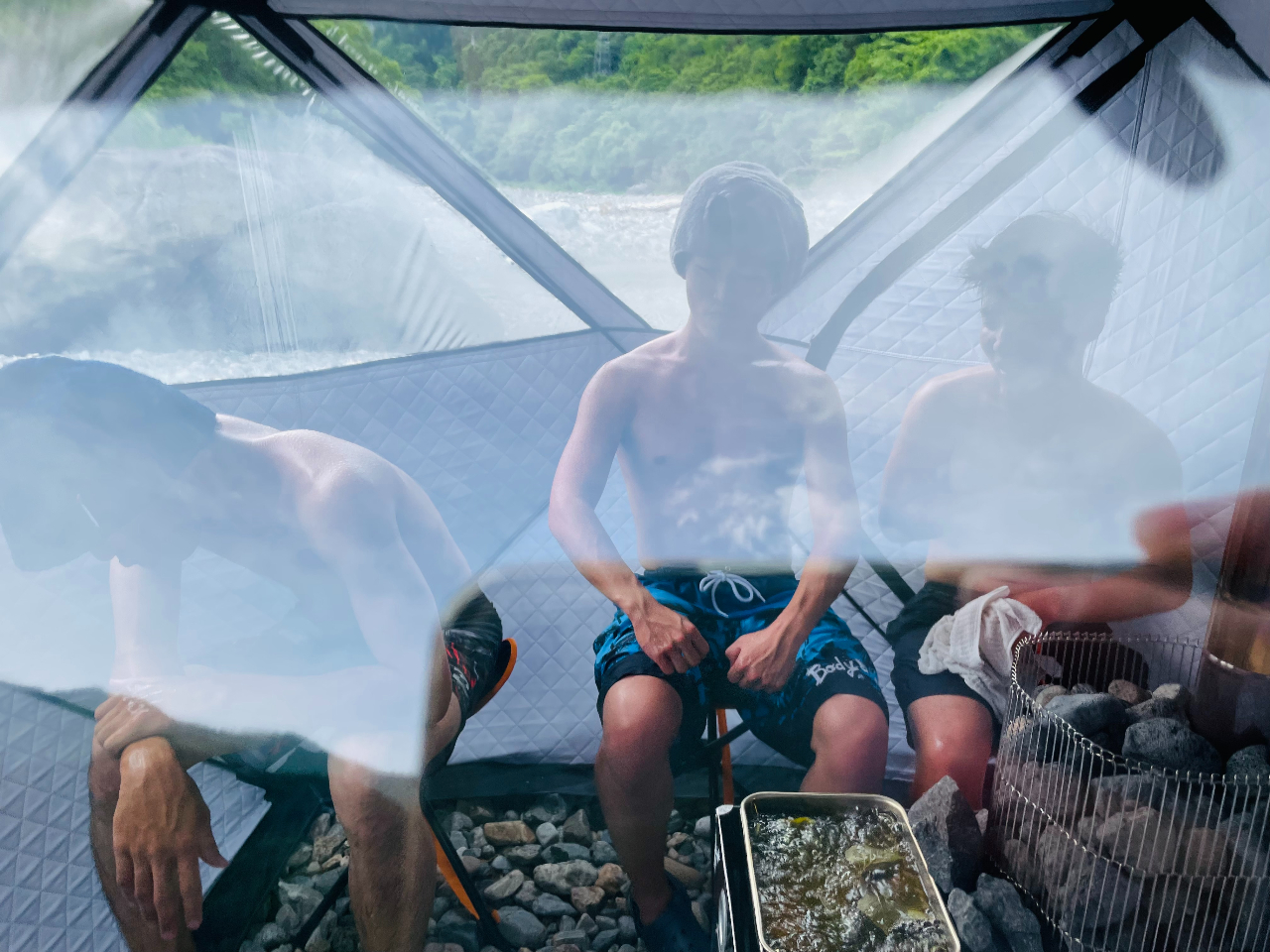 テントサウナの機材や川の水風呂について説明いたします。