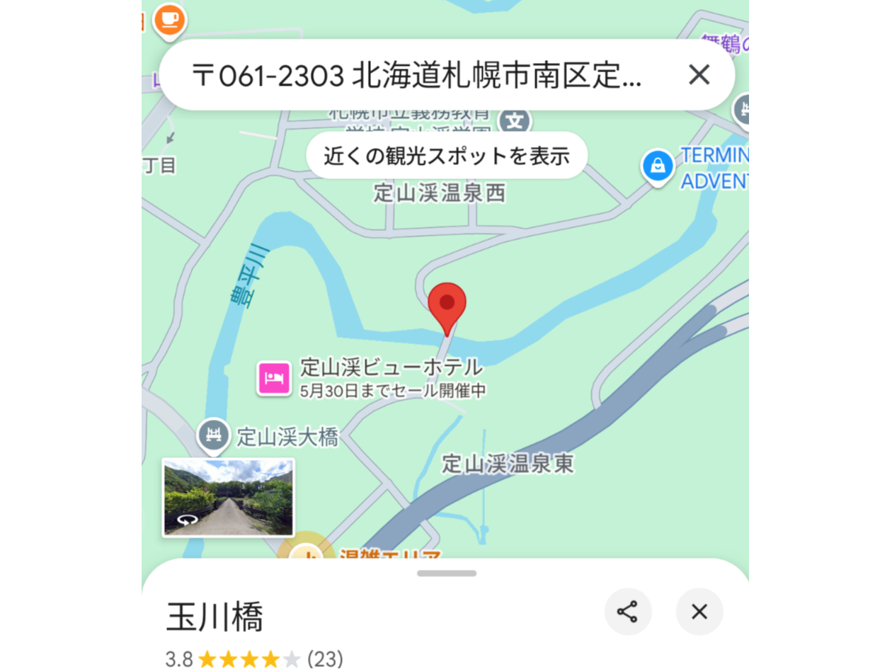 | 体験場所 | 〒061-2323 北海道札幌市南区定山渓温泉西1丁目 札幌市定山渓玉川橋周辺 |