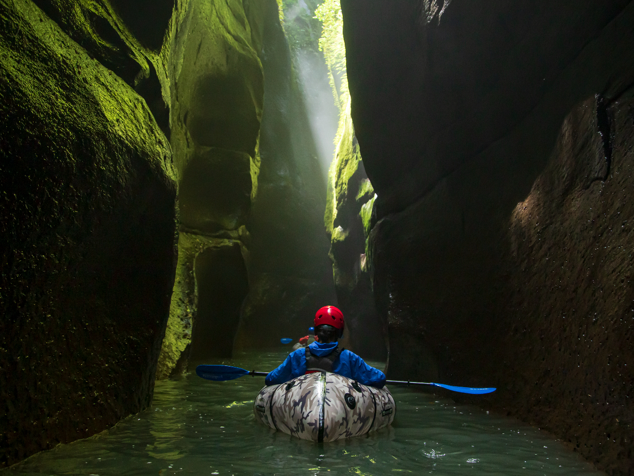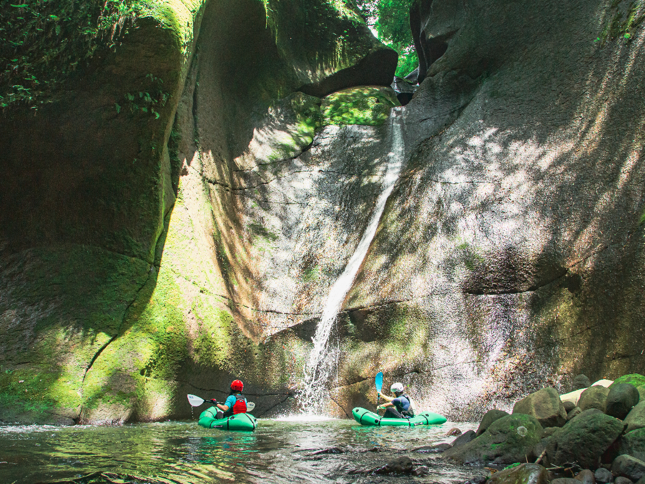 由布院温泉・別府温泉から30分の秘境:由布川峡谷を、軽量のパックラフトで冒険するツアーです!