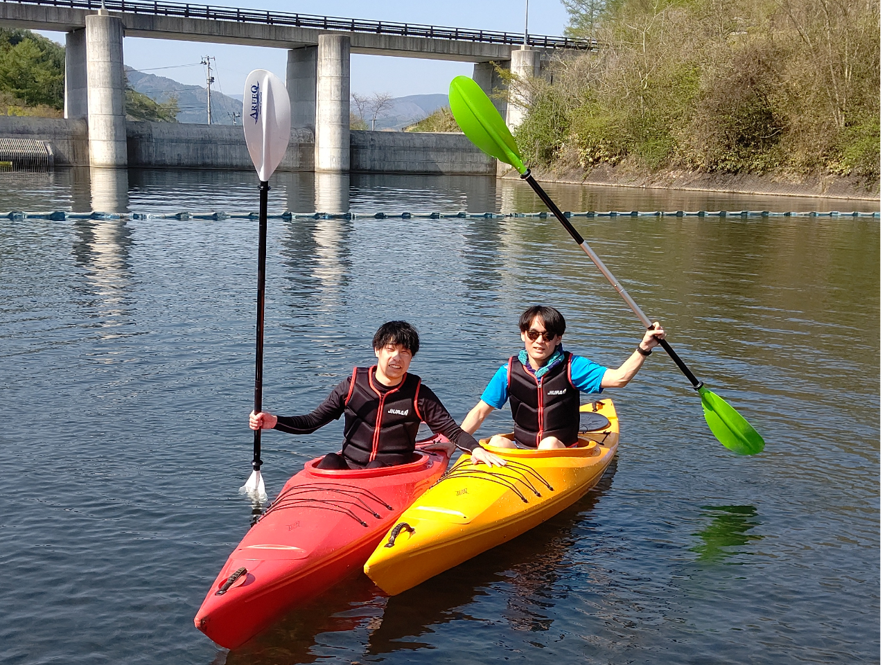 遠野第二ダムのながれの緩やかなエリアなので初心者・未経験者の方から楽しむことが出来ます。カヤックは、お子様(小学生)と一緒に乗って漕ぎ進めれます。
