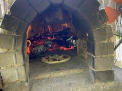 石窯でピザを焼きました!左はアルミホイルで巻いた焼き芋です。